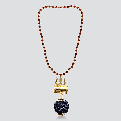 The Mahakaal Kavach has a Panchmukhi Rudraksha at the center with a Trishul and Shiva’s Damru embedded, binded together in a chain. You can place a special request for the Rudraksha to be energised by special prayers made in your name.